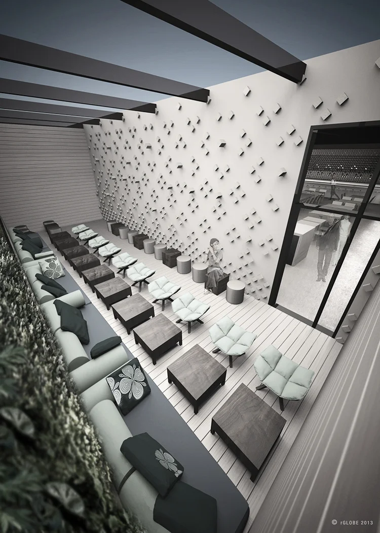Precisely positioned pieces, slightly angled faces, color accents, added and deleted elements all come together to generate choreographed variations to a textile like pattern with subtly differentiated applications to both interior and exterior spaces. We figured a field of beauty and intricacy would be the perfect compliment to the depth and complex flavors to be tasted and experienced in the space.